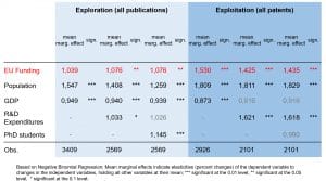 While the first model simply focuses on pure quantity of knowledge production, the second model version tries to go beyond and provide some insight about the quality of the knowledge outputs. Thus, the second version uses only the number of high quality knowledge exploration (the most cited nanotechnologies publications – top 10%) and exploitation (the biggest patent families – top 10%) as dependent variable. Indeed, we find that the EU funding effects increase on knowledge exploration, but slightly decrease for exploitation. R&D expenditures become a highly significant determinant for exploration but is not significant anymore for exploitation, where model 2 and 3 lose have no significance at all, probably due to a small number of observations.